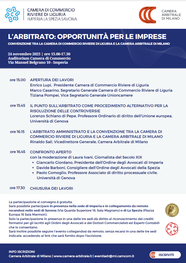 Convegno L’arbitrato: opportunità per le imprese - convenzione tra la Camera di commercio Riviere di Liguria e la Camera arbitrale di Milano