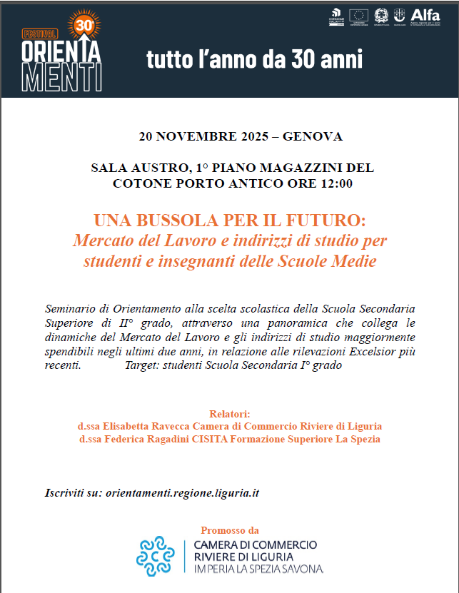 Seminario del  20 NOVEMBRE 2025 ORE 12 promosso CCIAA Riviere di Liguria" UNA BUSSOLA PER IL FUTURO: Mercato del Lavoro e indirizzi di studio per studenti e insegnanti delle Scuole Medie" (link esterno)