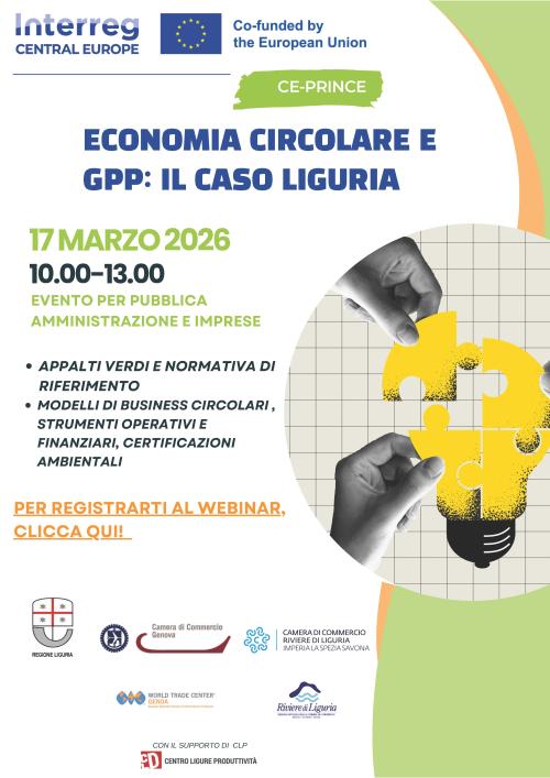 Entra nel vivo il supporto alle realtà liguri che puntano sulla sostenibilità. Sono già disponibili i posti per il percorso di formazione gratuita targato Ce prince (central Europe green procurement and innovation network for circular economy). L’iniziativa si propone come un supporto tecnico e operativo che Regione Liguria, insieme alle camere di Commercio di Genova e Riviere di Liguria, ha messo a punto per aiutare aziende e uffici pubblici a districarsi tra i nuovi obblighi e le opportunità dell'economia circolare. Un percorso che prenderà il via ufficialmente martedì 17 marzo 2026, con la prima delle sei tappe in programma.