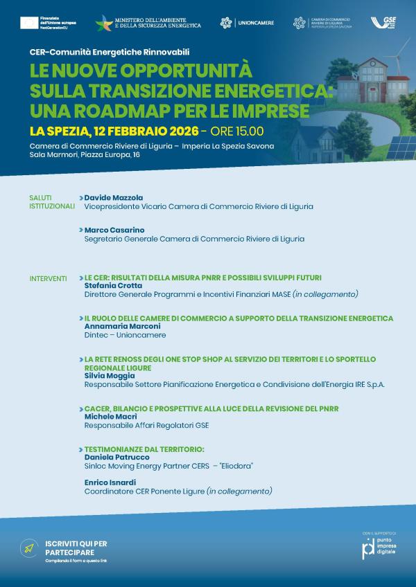 L'evento si è temuto il Giovedì 12 febbraio 2026, ore 15:00 nella sede della Spezia della Camera di Commercio Riviere di Liguria - Piazza Europa, 16 partecipazione in presenza o da remoto