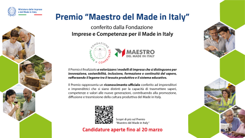 È online l’avviso pubblico per il Premio "Maestro del Made in Italy", il riconoscimento promosso dalla Fondazione Imprese e Competenze per il Made in Italy. Istituito con Decreto del Ministro delle Imprese e del Made in Italy di concerto con il Ministro dell'Istruzione e del merito, il Premio celebra l’imprenditoria capace di farsi scuola: non solo eccellenza produttiva, ma impegno concreto nel tramandare competenze, saperi e cultura del mestiere alle nuove generazioni, attraverso attività formative strutturate e documentabili, contribuendo alla continuità e all’evoluzione del saper fare italiano.