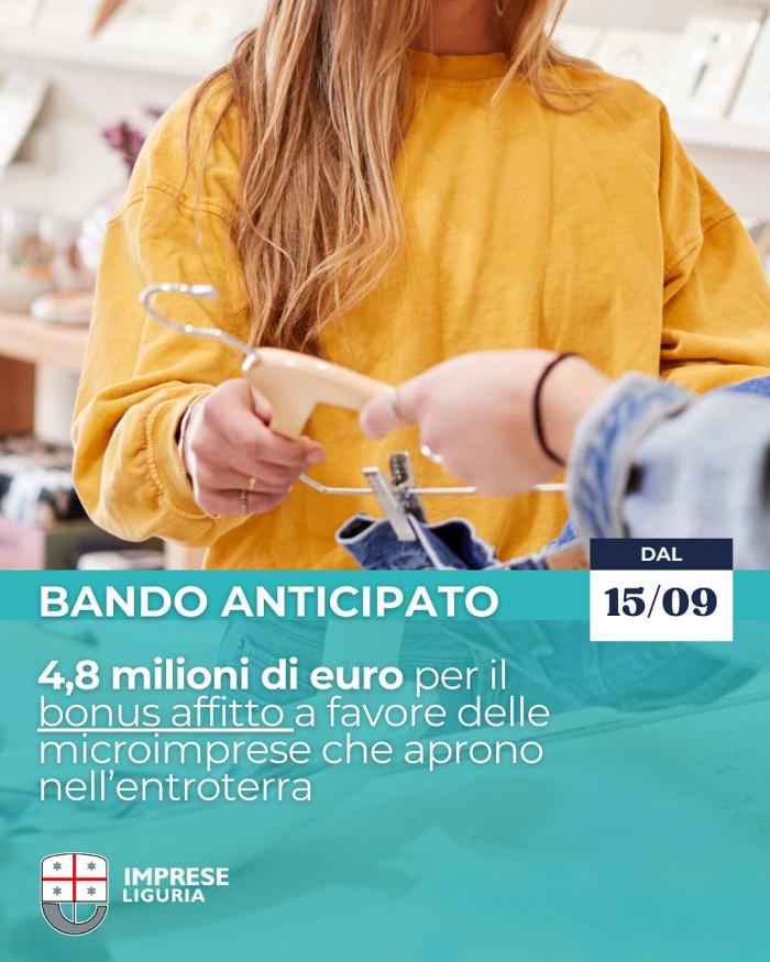 Nuovo bando Entroterra. Bonus affitto per le nuove imprese del commercio, artigianato, ristorazione e servizi REGIONE LIGURIA: Informazioni nel sito REGIONE LIGURIA: regione.liguria.it/homepage-sviluppo-economico/ultime-dal-canale/bonusaffittoimpreseentroterra/publiccompetition/entroterra_nuoveimprese_camcm.html link esterno